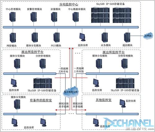 因而,市级平台所有中科蓝鲸的SkySAN IP-SAN存储设备集中安装在市内,提供海量存储容量。完全满足该平安城市视频监控系统对海量存储容量和可扩展性的要求,而且方案布局能够充分发挥SkySAN出色的机群管理特性,极大地降低大规模监控中心的维护成本和故障响应时间。