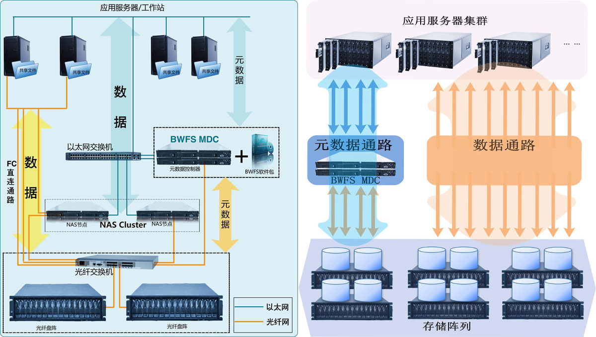 BWFS(Blue Whale File System)是中科蓝鲸针对FC SAN/IP SAN环境推出的集群文件系统产品。它可以将多台FC或iSCSI磁盘阵列转换成支持多服务器并行处理的存储集群,提供高性能、可扩展的文件共享服务,并支持多机工作流或集群环境下的各种应用。