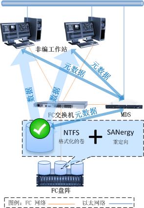 以典型的“卷共享软件”SANergy为例,看下他是如何工作的:文件系统层面采用本地文件系统进行格式化,可以用NTFS、UFS(或者其他SANergy支持的本地文件系统),SANergy将标准网络文件协议(CIF或NFS)的数据I/O操作部分“劫持”从LAN重新定向到“由MDC所主导管理的且被所有客户端所挂载并直接访问的来自于SAN的卷上的本地文件系统”。