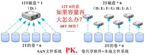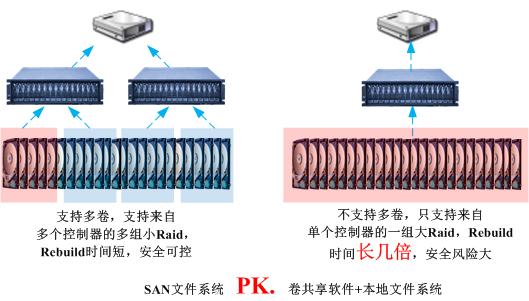 本地文件系统大多只支持单卷,所以性能提升空间就很有限,也限制了“卷共享软件+传统的本地文件系统”这种方式的应用规模。就绝大多数的盘阵产品所支持的功能来看,一个卷只能来自于一个Raid组,而一个Raid组的性能提升空间是有限的(Raid组如果越大硬盘数量越多看起来性能带宽应该是越大才对,但实际上随着Raid组容量增大所需要承载的并发访问量也就越大,所面临的就是并发访问量增加带来的随机性压力问题反而可能使Raid组性能下降)。而SAN文件系统支持多卷,多卷可以来自多个Raid组甚至多个设备,这样多卷磁盘轮动效应会带来更大的性能提升空间,另外在线扩容等高级功能,不支持多卷也是能难实现的。更重要的是从安全角度看,支持多卷多Raid以后,每个Raid组的大小就可以相对小,如果硬盘出问题,Raid组Rebuild的时间就会明显缩短(现在比较新的中端盘阵,在访问压力较小的情况下,15块1T盘Raid5的Rebuild时间大致是16个小时左右,如果是老设备、或者访问压力大、或者2T盘这种更大容量的时候Rebuild时间就会再增加很多;反而如果是做小的Raid,比如3组5块1T盘Raid5的Rebuild时间大致只有大Raid的1/4左右),而且即便考虑极端情况一个Raid组坏掉也只是影响部分数据(而且高端的SAN文件系统还有镜象实时容灾解决方案),而“卷共享软件+传统的本地文件系统”模式下如果Raid很大Rebuild的时间长数据丢失的风险就明显大了很多,并且Raid组坏掉所有数据会全部丢失(很多数据丢失就是在Rebuild未完成之前又掉盘造成的)。