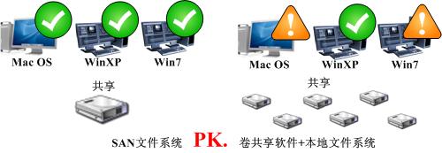 由于现在满足同一种业务可能同时用到2个以上的操作系统,例如有客户同时在使用windows和Mac并且在同一个FC SAN的环境中,windows这边使用SANergy互相共享性能还不错,但由于“SANergy+NTFS”无法同时支持Mac,所以windows和Mac之间通过CIFS和AFP(需确认)在两种操作系统间倒数据非常不方便和耗时(注意一个原理上的差别,不是SANergy这个“卷共享软件”不支持Mac,而是“SANergy+NTFS”不支持Mac。)。采用了SAN文件系统以后就解决了这个问题。