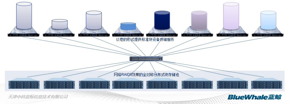 中科蓝鲸BWRAID是一个以标准存储服务器(x86)为存储硬件、通过软件核心技术构造标准遵从的集群SAN存储系统。 系统对内把存储节点聚合成统一存储池,整体实现存储节点间网络RAID5的冗余保护效果,能保证设备级故障情况下的数据可靠性和业务连续性;对外以卷的形式提供标准块设备存储服务。