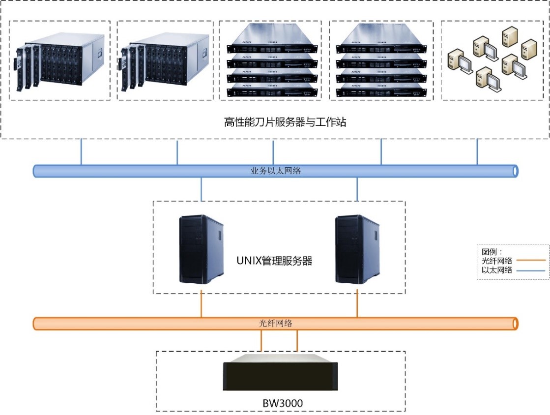 采用中科蓝鲸BWStor BW3000存储设备一台,通过FC光纤通道连接两台管理节点为其提供存储空间,保持了用户原有的存储使用方式:管理节点运行用户原有的UNIX操作系统,通过管理节点为前端十几台高性能Dell刀片服务器与工作站提供存储。